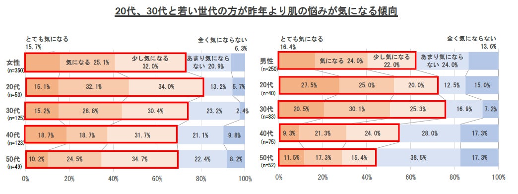 そこで今年は昨年に比べ肌の悩みが気になることがあるか聞いたところ、「とても気になる」(16.0%)、「気になる(24.7%)、「少し気になる」(27.8%)が約7割(合計:68.5%)となり、昨年より肌の悩みが気になる傾向が明らかとなった。性別では、女性(合計:72.8%)の方が男性(合計:62.4%)より肌の悩みを感じ、年代別では20代、30代を中心に若い世代の方が肌の悩みが気になる傾向があった。