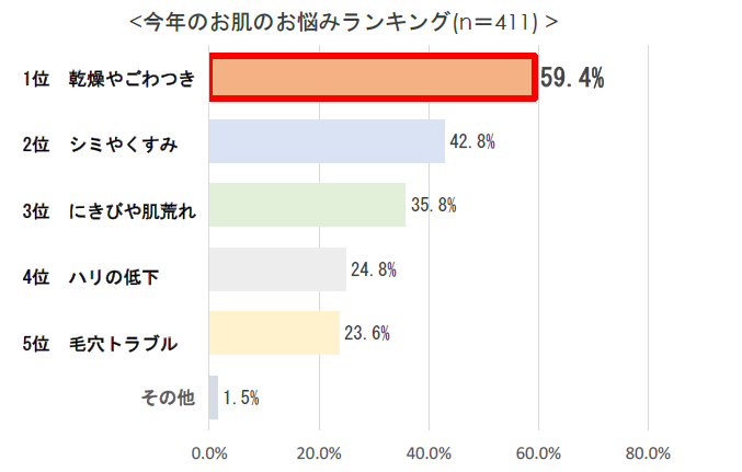 今年の肌の悩みの1位は「乾燥やごわつき」(58.6%)。全ての世代で1位となる。