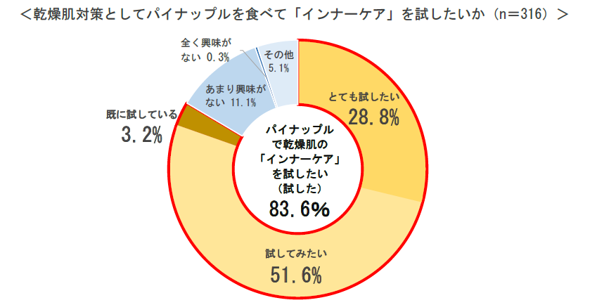 「乾燥肌」対策として果物を食べて「インナーケア」を試したい人に、肌の保湿力 (バリア機能)を高める機能性関与成分のあるパイナップルを試したいか聞いたところ、「既に試している」(3.2%)、「とても試したい」(28.8%)、「試してみたい」(51.6%)と83.6%がパイナップルを試したいと回答した。