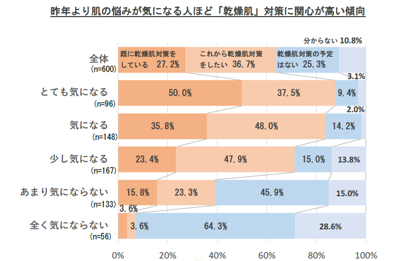 また、36.7%が「乾燥肌」対策はこれから行いたいと考えており、昨年より肌の悩みを感じている人ほど「乾燥肌」対策に関心が高い結果となった