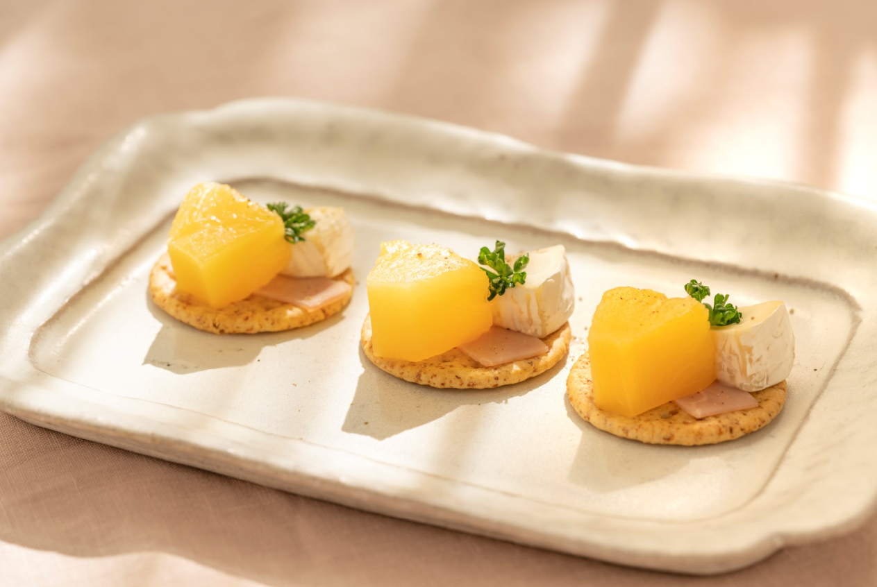 一日の摂取目安量の「パイナップル由来グルコシルセラミド」を摂りきれない時に、間食やアペタイザーとして 約半量を補充できるレシピです。タンパク質、炭水化物、食物繊維をバランスよく摂ることで、タンパク質の吸収が良くなり、腸内環境を整える効果も期待できます。カマンベールチーズの濃厚さとパイナップルのジューシーな甘さが口の中で交わり、少量でも満足感が高まります。カマンベールに含まれる抗酸化作用のあるパルミチン酸やビタミンB2には、アンチエイジング効果も期待できます。また、食物繊維と糖質が含まれるため、食事の前に間食アイテムとして召し上がることで、空腹時の食事で起きやすい急な血糖値上昇の予防にも繋がります。