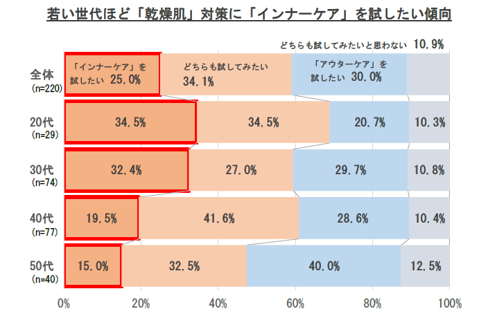 これから乾燥肌対策を行いたいと考えている人に、化粧品や美容液を使った「アウターケア」と肌に良い成分の含まれた食品や食材、サプリなどを摂って肌を内側から整える「インナーケア」のどちらを試したいか聞いたところ、性別では女性(21.5%)より男性(32.4%)、年代別では20代(34.5%)と30代(32.4%)を中心に若い世代ほど「インナーケア」を試したい傾向が 明らかになった。
