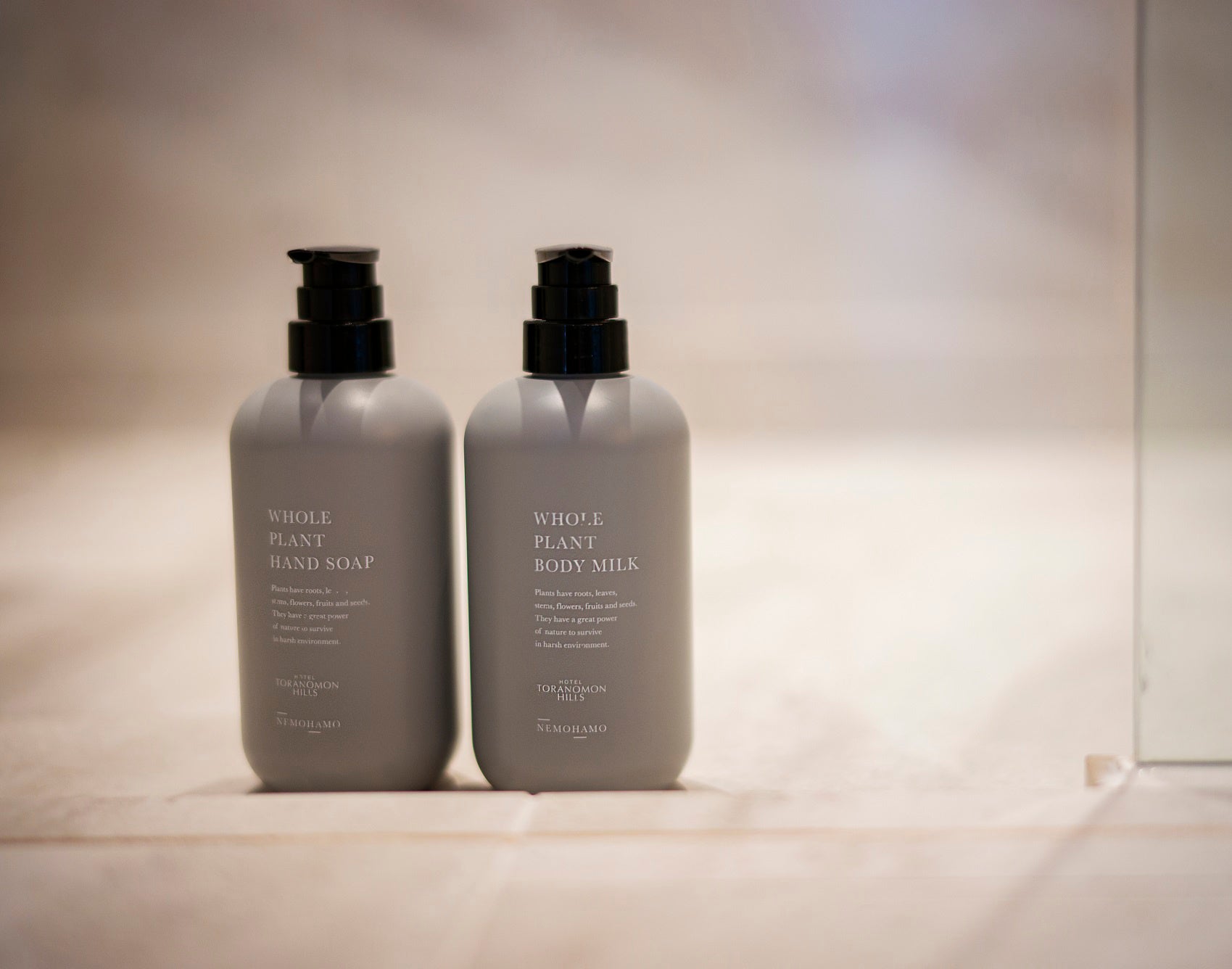 主な原料植物は、有機JAS 認証を取得した里山・自社農園で化学肥料を使わず育てており、育成状態を見極めながら旬の時期に手摘みで収穫し植物まるごとから栄養素を抽出しエキス化しています。また、各容器は環境負荷を軽減する取り組みとして、90% 以上がサトウキビの廃液由来の素材でできているバイオマスPE を採用しており、本来捨てられていた原料を再利用できる上、バイオマスPE は通常の樹脂と比較して、製造・輸送・廃棄までのCO2 の排出量を約7 割削減しています。こういった製品づくりに対する真摯な姿勢とサステナブルな取り組みが評価され、積極的にリサイクルに取り組み、飲料水を提供する浄水器専用の水栓を全室に備えるなど、環境に配慮したサステナブルな取り組みを行う「ホテル虎ノ門ヒルズ」での採用に至りました。
