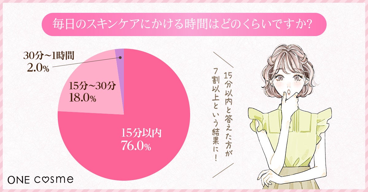 20代のONEcosmeユーザーのほとんどが、1日のうちスキンケアにかける時間は15分以内と回答しました。