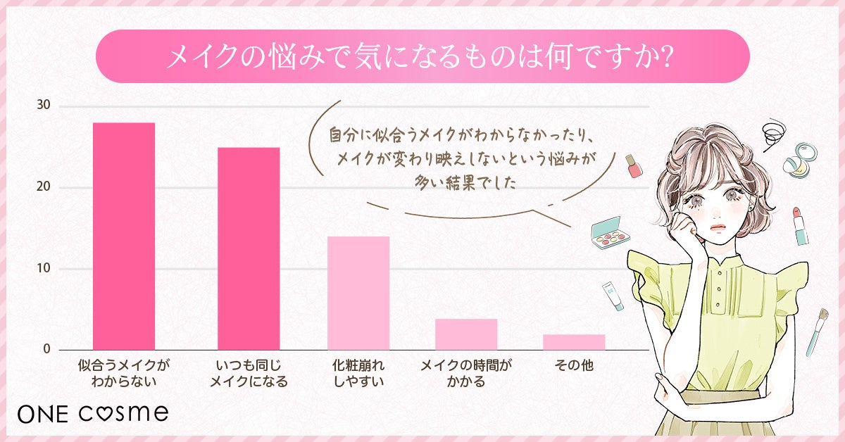 次にメイクの悩みを伺ったところ「自分に似合うメイクがわからない」「いつも同じメイクになる」と悩んでいる方が多い結果になりました。自分に似合うメイクがわからないまま、いつもと変わり映えしないと悩む方が多いとわかります。