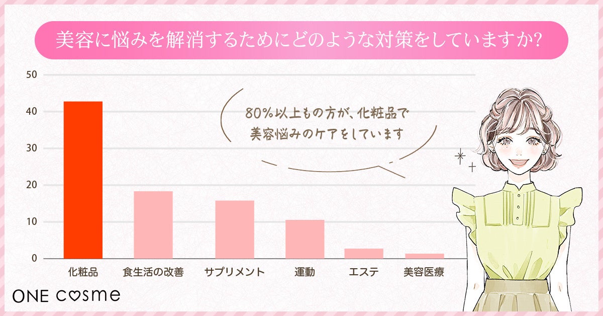 美容悩みを解消するための対策として、80%以上の方が化粧品を使用していることがわかりました。化粧品は最も手軽に取り入れられ、早く効果を実感できるアイテムです。