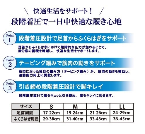 長年蓄積した段階的な着圧の切替を行って、靴下会社が得意とする肌触りの良い短繊維素材を使用した寒くなりだした季節に最適のサポーターです。