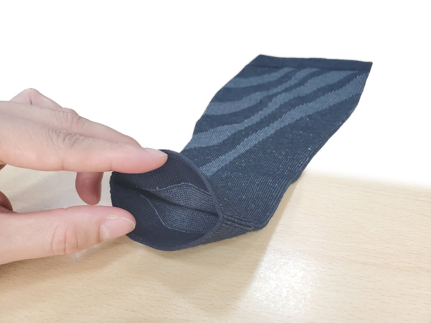 また裾部分は、靴下を履いて頂く事を前提としておりますので、サポーターの裾部分と靴下の履き口部分が重なってしまいます。その為生地をフラットな1重生地で編みだす事を開発し、靴下を重ねて着用しても締まりすぎないように工夫を行った。
