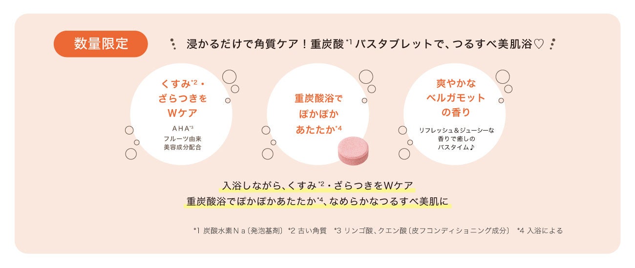 このたび新発売する「meshimase バスタブレット」は、「ぽかぽか*2重炭酸浴」に加え、AHA*3とビタミンC誘導体*4を配合。「浸かるだけで角質ケア」という美容効果を付加価値とし、日々の入浴を美容ケアの時間としてお楽しみいただけるアイテムです。