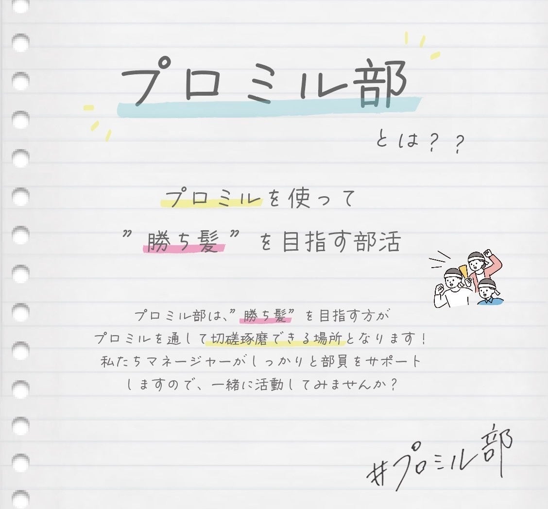 「プロミル部」は、【Promille】の商品を使うことで悩みに負けない”勝ち髪”を目指し、自信をもって様々なことに挑戦してほしいという想いから発足しました。”勝ち髪”とは、髪のうねり・広がり・アホ毛・乾燥など人それぞれの髪のお悩みすべてに打ち勝つ理想の髪のことを意味します。