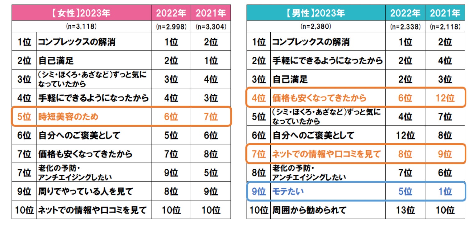 男女とも1位は「コンプレックスの解消」で、2021年から常にトップ2をキープしている。ここ3年で順位が上昇傾向にあるのは、女性は「時短美容のため」。男性は「価格も安くなってきたから」と「ネットでの情報や口コミを見て」。一方、男性の「モテたい」は2021年には1位だったが、2022年に5位、2023年には9位と順位を落としている。