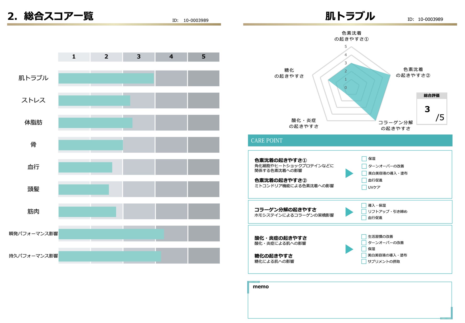 例えば、シミやニキビでお悩みの方は、肌トラブルが起きやすいのはどんな体質傾向が原因かが分かるので、適切な施術やケアがご提案できます。