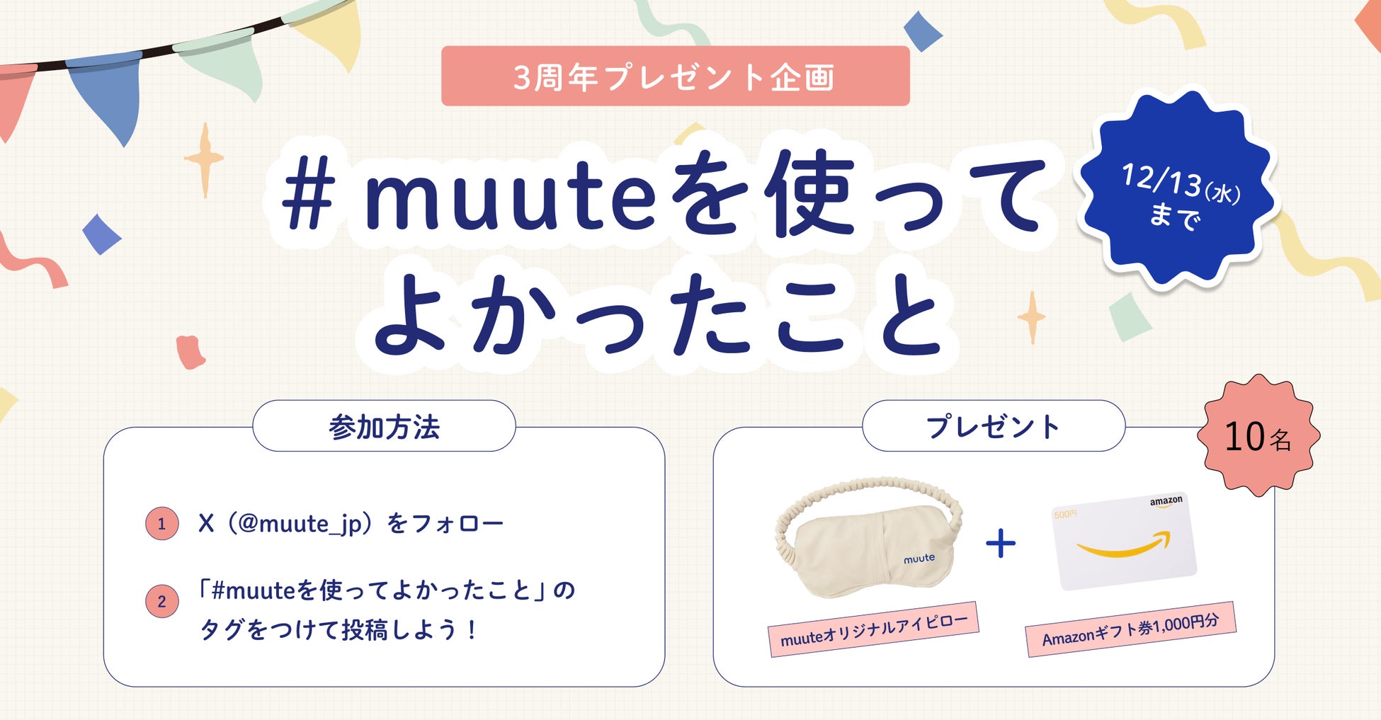 muute公式X(旧 Twitter)をフォローして、指定のハッシュタグ「#muuteを使ってよかったこと」をつけて投稿していただいた中から抽選で10名様に「muuteオリジナルアイピロー」と「Amazonギフト券1,000円分」をプレゼントするキャンペーンを実施します。詳細はmuute公式X(旧Twitter)をご確認ください。
