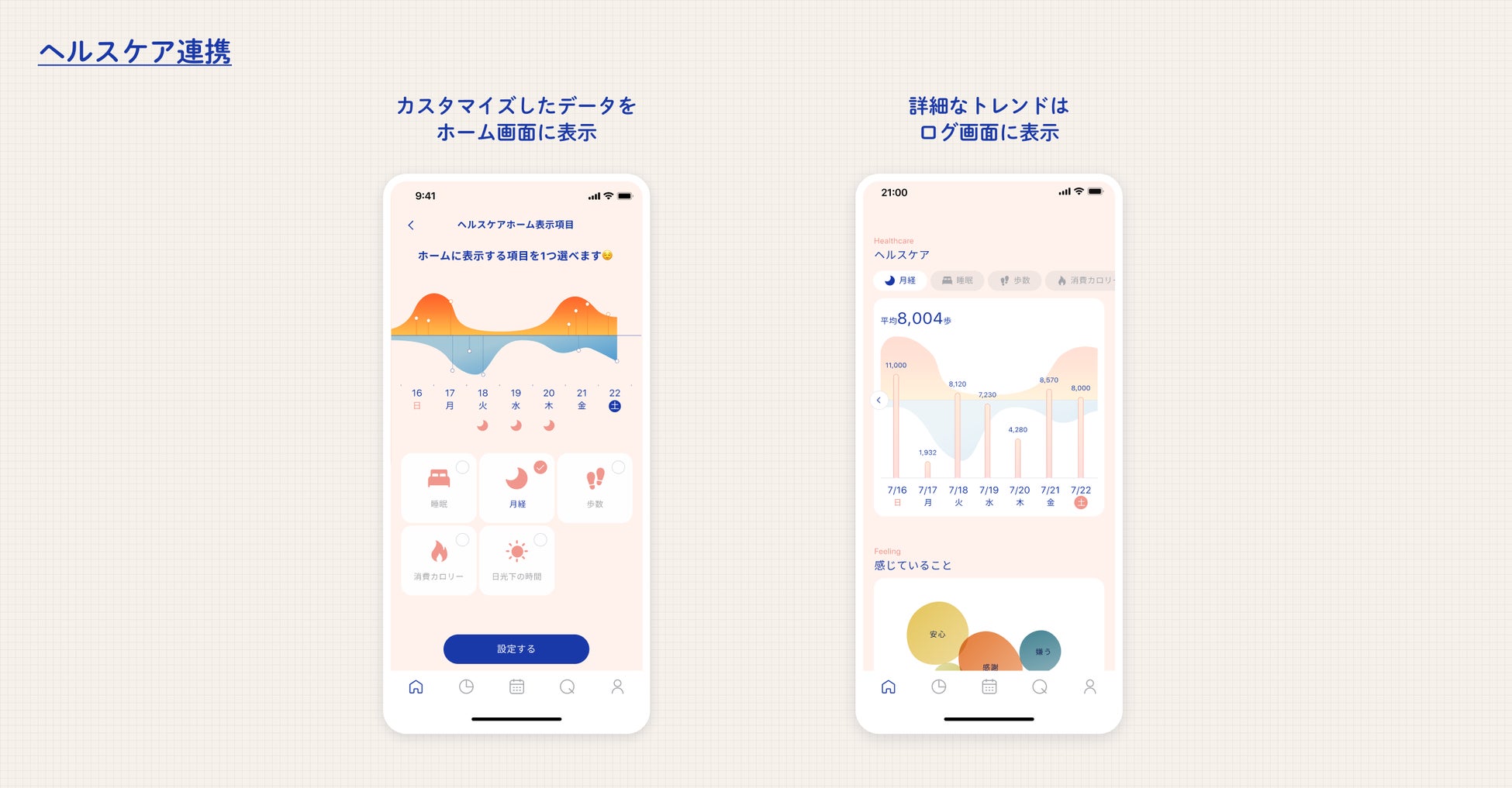 カレンダーアプリ(※iPhoneの標準カレンダーとGoogleカレンダー)と連携できる機能をリリースしました。連携すると登録した予定が反映され、感情との関係性を一覧で見ることができます。週単位の表示にも切り替えられるので、お好みでカスタマイズしていただけます。予定を照らし合わせながらの振り返りや、ジャーナリングの習慣化にお役立てください。