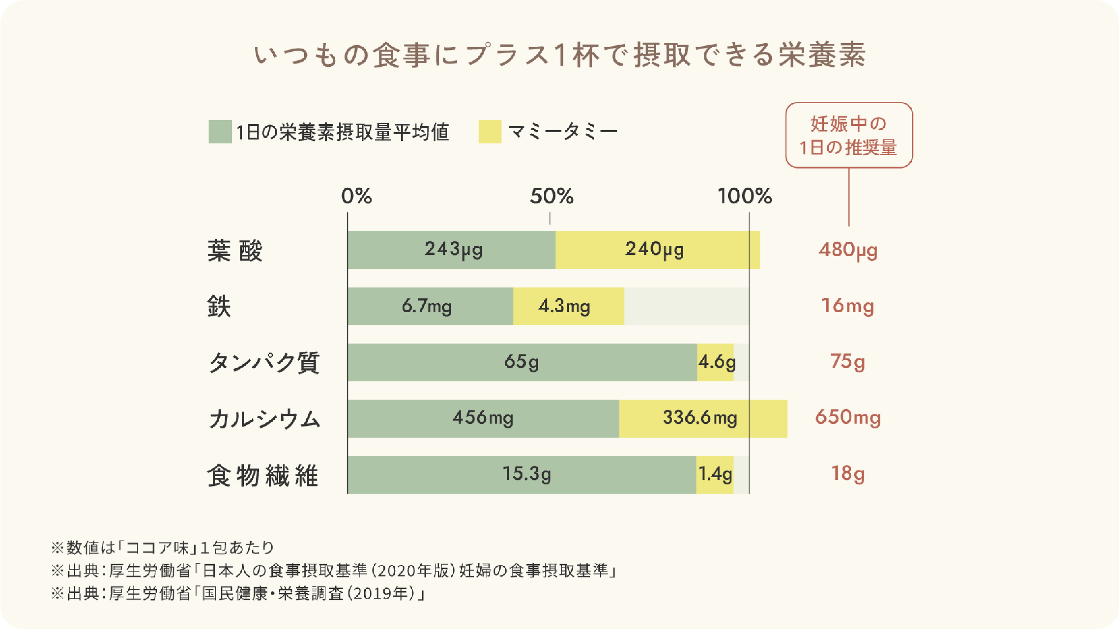 一般的に「不足しがちな栄養素」に加え、妊娠すると赤ちゃんのために「プラスすべき栄養素」が増え、どちらも摂取していく必要があります。また、産後も鉄分やカルシウム、タンパク質などの栄養素が不足しがちです。しかし3食の食事だけでは理想の栄養素量を摂取できないことも。ママにとっても赤ちゃんにとっても重要な時期だからこそ、摂取してほしい成分を厳選して配合しました。