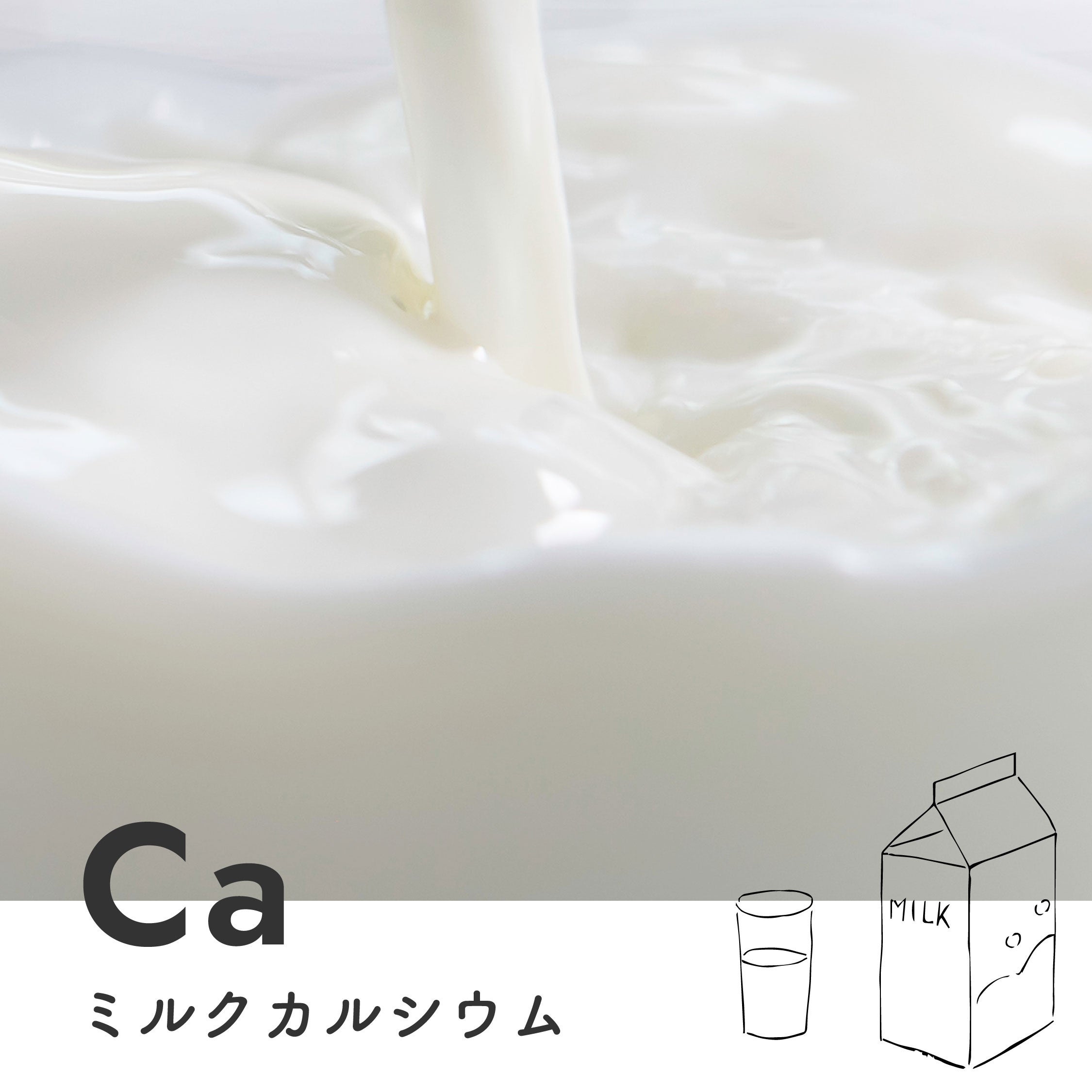 吸収のよいカルシウムを豊富に含む牛乳(乳清)から抽出した、100%牛乳由来のカルシウムです。