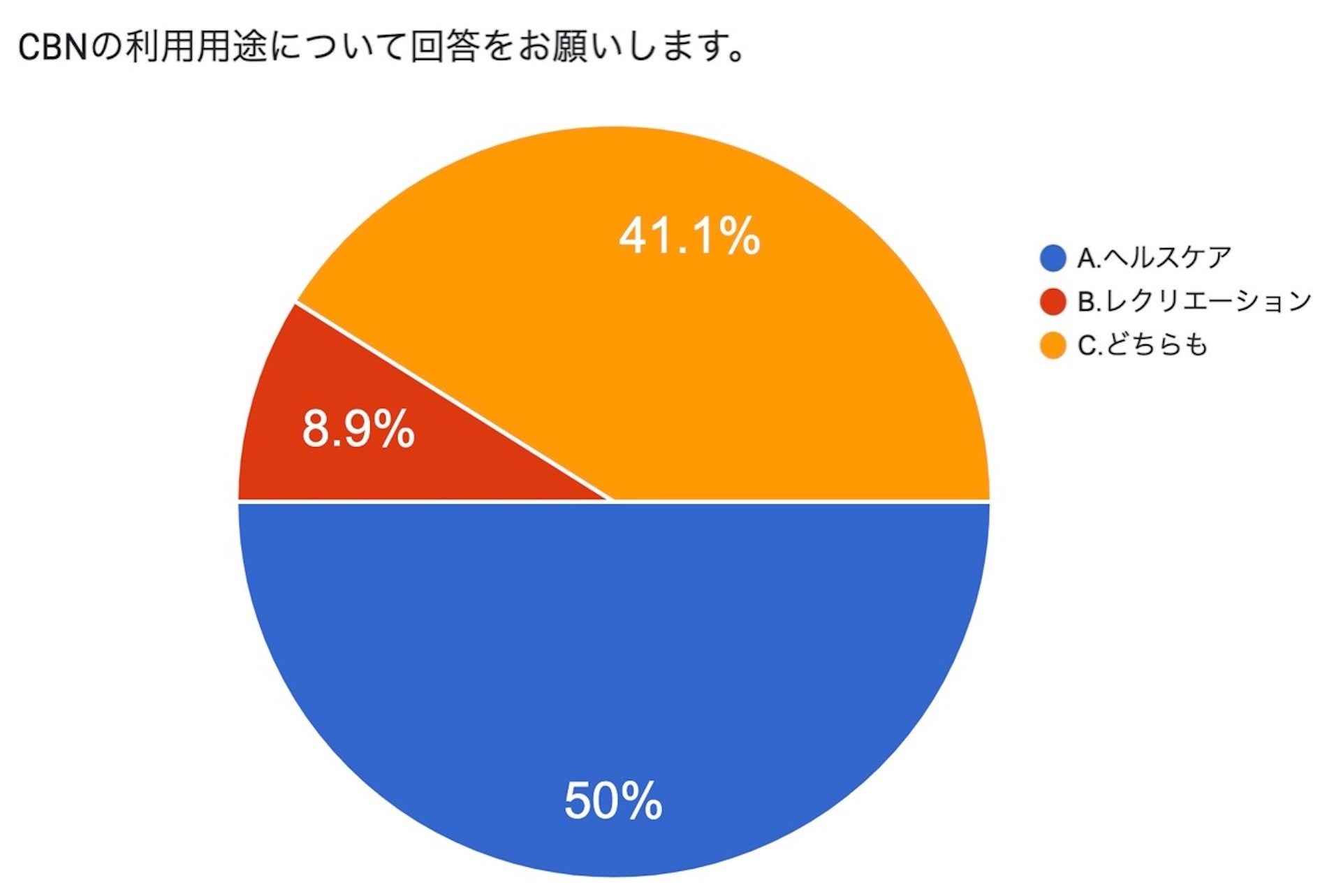 CBNの用途としては50%がヘルスケア目的、8.9%がレクリエーション目的、41.1%がその両方と回答しました。