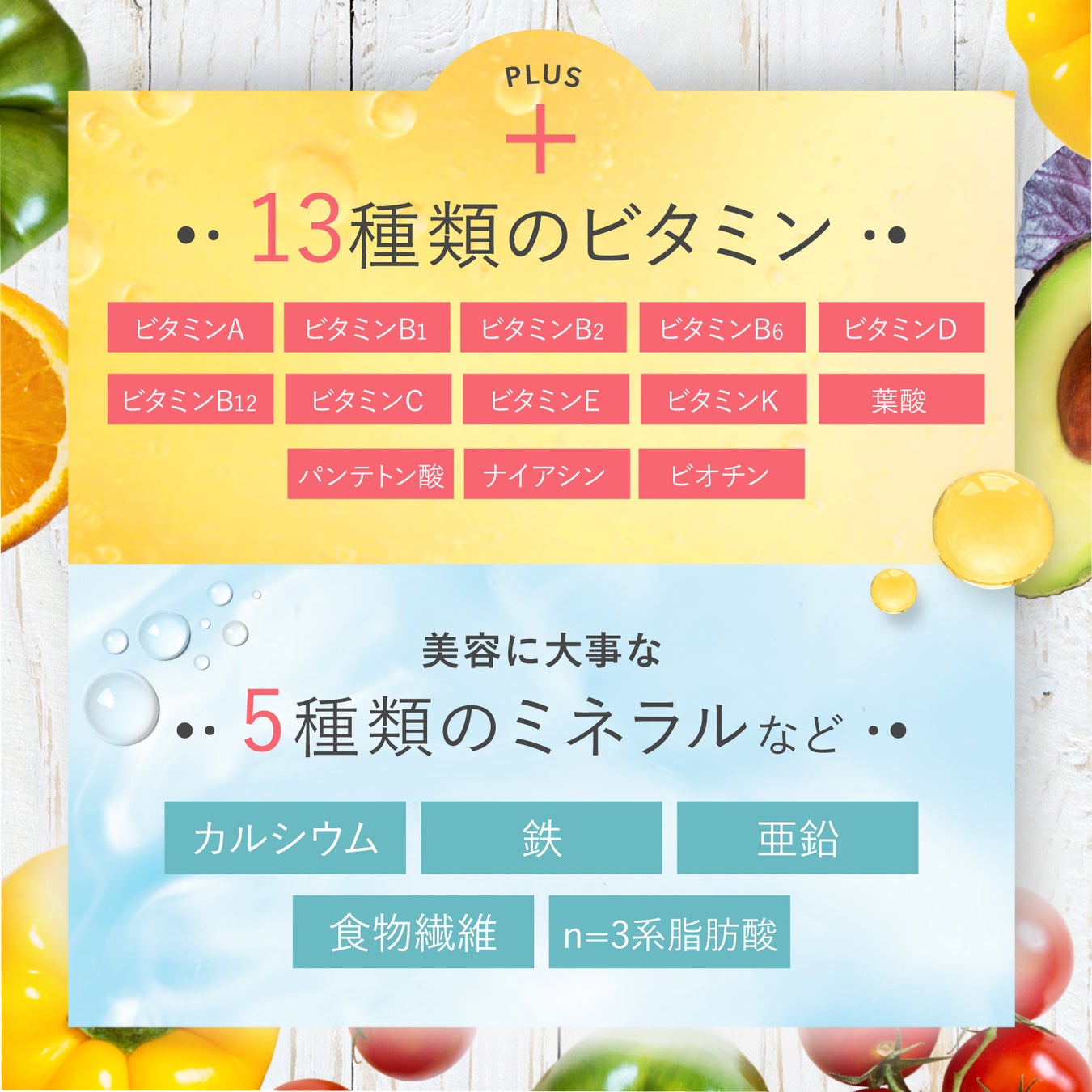 ※ 厚生労働省が定めた「食事摂取基準」をクリアしていて、美容ために1日に必要な栄養素(ビタミンA,ビタミンD,ビタミンE,ビタミンB1,ビタミンB2,ビタミンB6,ビタミンC,ナイアシンパンテトン酸,ビオチン,鉄,亜鉛)を100%以上摂取できることを「完全美容」と当社で定義しています。