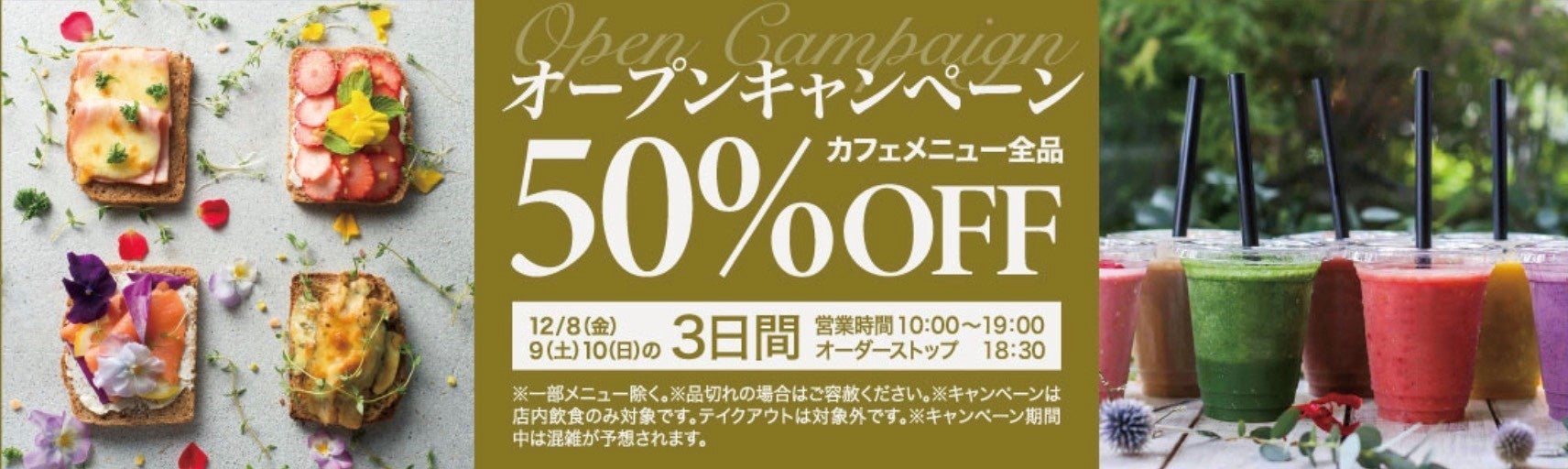 12/8(金)、9(土)、10(日)の3日間 カフェメニュー全品50%OFF
