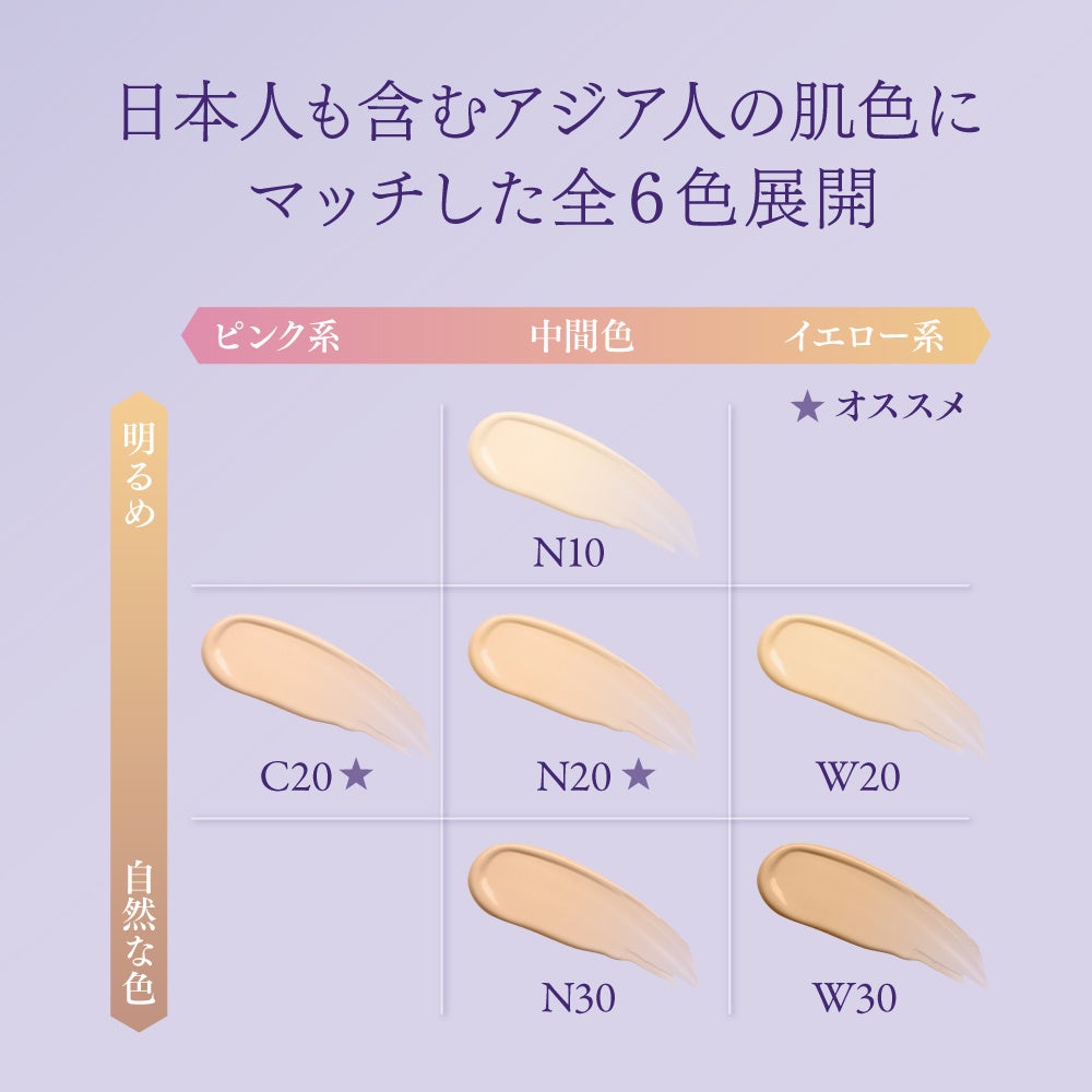 日本人を含むアジア人の肌色にマッチした全6色で展開するルミマットは、軽い微粒子がうす膜を形成し、肌と一体化するように密着するリアルスキンフィルム処方を採用。30時間(*1)崩れにくいのに心地よさが続き、さらに毛穴レス(*2)で透明感のある肌(*3)に導きます。また保湿成分として、ナイアシンアミドを配合。わずか半プッシュ(小さめパール一粒分)の少量で顔全体に使える伸びの良さも特徴です。
