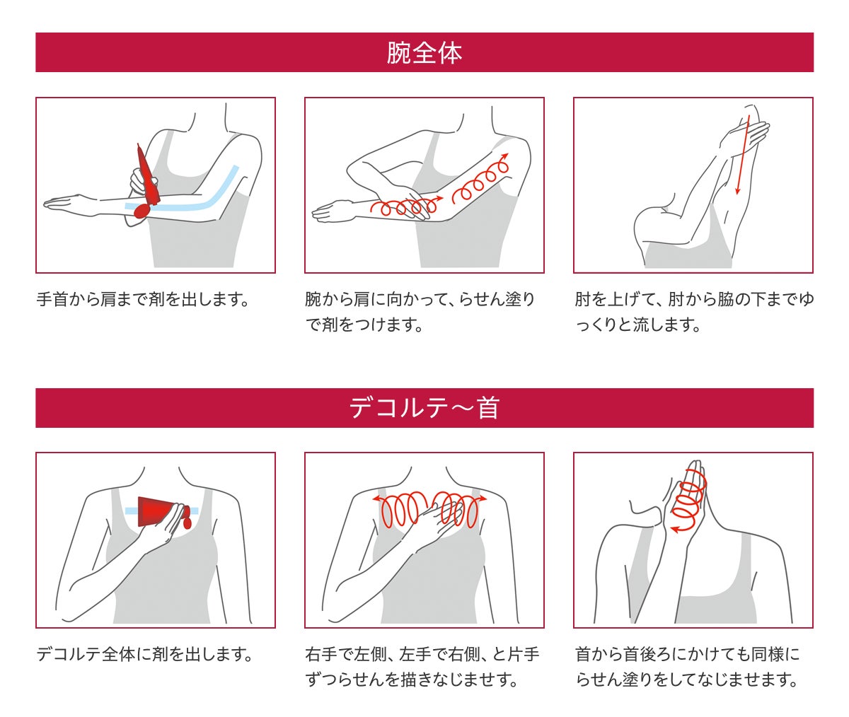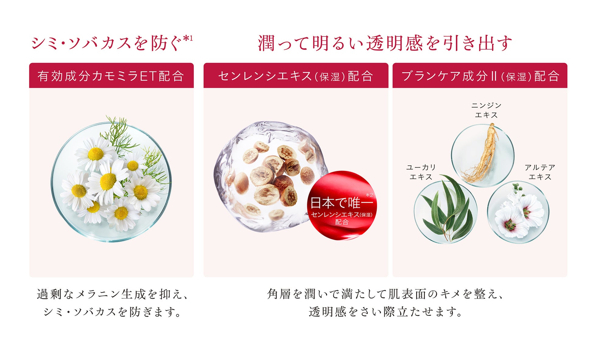ボディもフェイスも同じようにいたわってほしい。そんな思いでフェイスケアアイテムと同様の有効成分と美容成分を配合。有効成分「カモミラET」配合でメラニンの生成を抑え、シミ・ソバカスを防ぎます。また保湿成分「センレンシエキス」と独自のブランケア成分Ⅱ(保湿)配合で角層を潤わせてキメを整え、なめらかで透明感のある明るいボディへと導きます。
