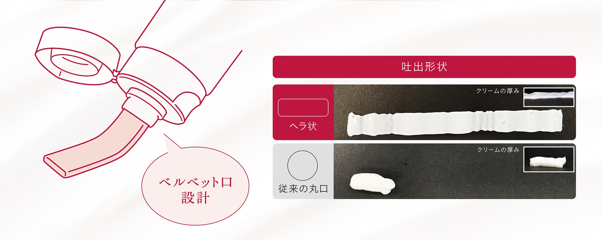 腕や脚、様々なパーツに使うボディセラムだからこそ、ノンストレスでなめらかに拡がって肌になじむことが大切だと考えたアルブラン。使い勝手や機能性を向上させたいという思いから、新たな容器の開発に取り組みました。その結果、同じクリーム量を従来よりも約4~5倍薄く長く塗れるベルベット口の設計にたどり着きました。肌に直接塗ってもキャップが邪魔にならず、クリームが出ている様子が視覚的に見やすいのもポイント。クリームがまるでベルべットのようになめらかに拡がり、肌に心地よくなじみます。