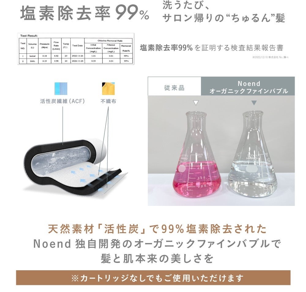 毛穴の奥まで届くオーガニックファインバブルだからこそ、肌や髪にダメージを与える塩素を活性炭で99%除去。通常、塩素除去フィルターには亜硫酸カルシウムが使用されますが、オーガニックファインバブルシャワーヘッドでは素材を厳選しました。活性炭はオーガニック素材のため、幅広い方々にご使用いただけます。