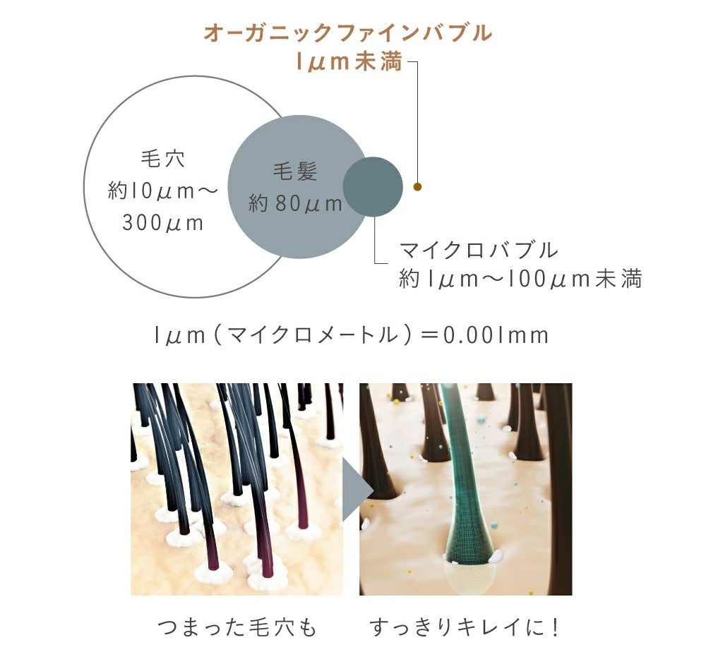 毛穴の汚れを浮かせて落とす洗浄力はオーガニックファインバブルの大きさに理由があります。毛穴が約10~300㎛、毛髪が80㎛、マイクロバブルが約1~100㎛未満、そしてオーガニックファインバブルは1㎛未満。つまった毛穴もすっきりきれいに洗浄します。
