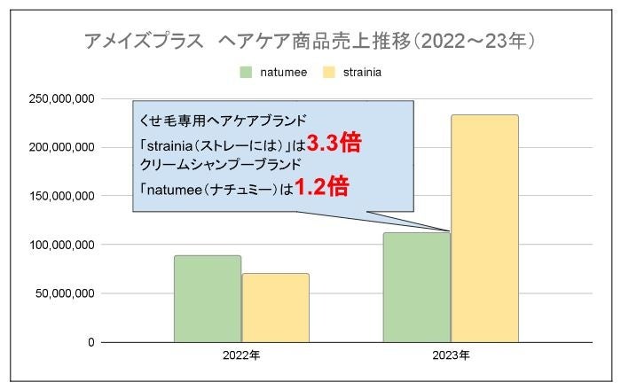ヘルスケア商品を企画開発する株式会社アメイズプラスのヘアケア商品の売上も好調で、2023年の売上は前年の売上を大きく上回りました。髪の自由化をきっかけに、消費者のヘアケアに対する興味関心が年々増加しているのがわかります。