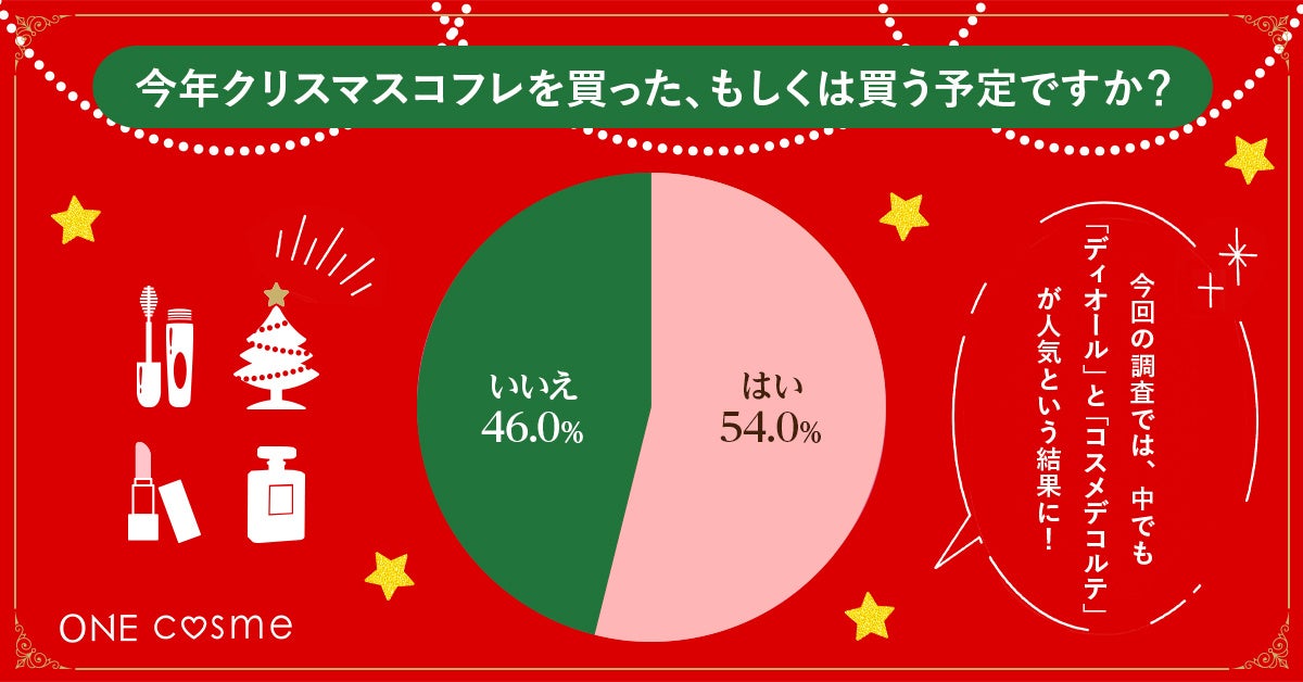 「今年クリスマスコフレを買った、もしくは買う予定がありますか?」という質問には54%の人が「買った、もしくは買う予定がある」と回答。