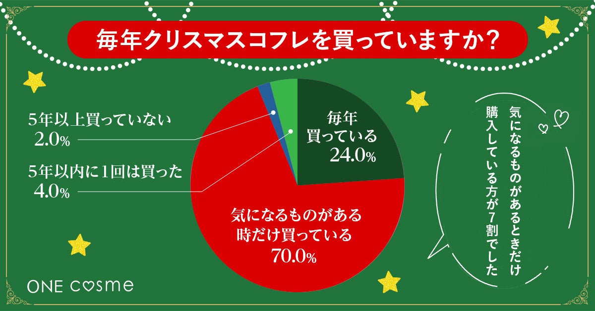 毎年あらゆるブランドから販売されるクリスマスコフレ。「毎年クリスマスコフレを買っていますか?」という質問には、70%の人が「気になるものがある年だけ買っている」と回答しました。対して、毎年買っていると回答した人はわずか24%。