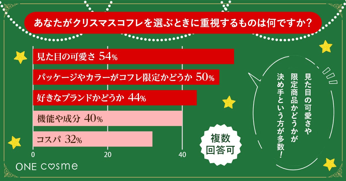 「クリスマスコフレを選ぶときに重視するものは?」という質問に対しては、54%の人が「見た目の可愛さ」、50%の人が「パッケージやカラーがコフレ限定かどうか」を選択しました。