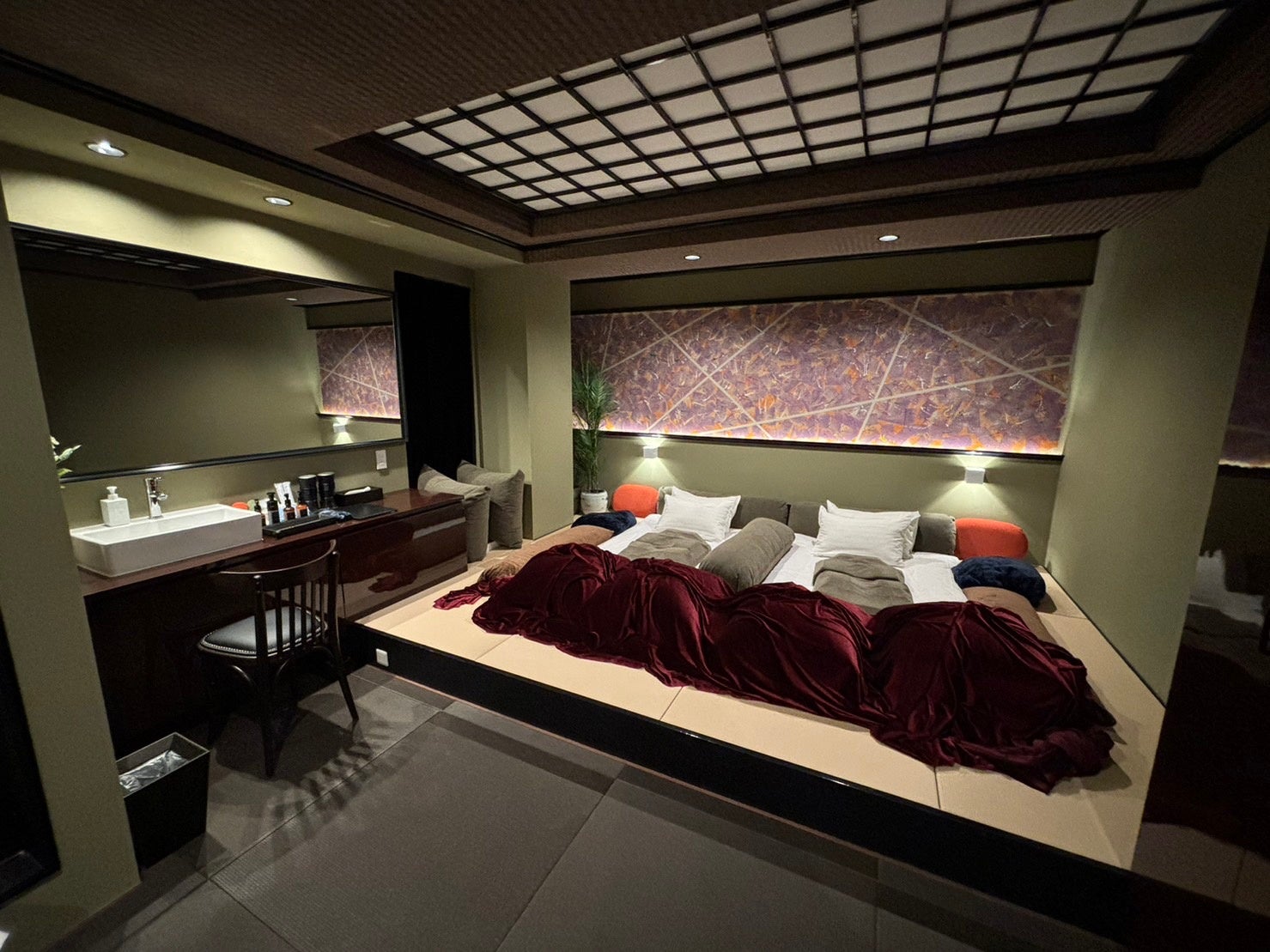 体重をかけて圧のしっかりとしたマッサージを体現したい為、通常の施術ベッドでは強度的にも機能的にも合いません。「Aroma’n SPA.CAT_BO キャットボー」では天然い草の和畳を使用したキングサイズの小上がりに、特別に仕立てた布団の上で施術を受けていただきます。他のリラクゼーションサロンでは出来ない、セラピストの想いを伝えるマッサージを体験してください。誰にも邪魔されないプライベートな空間で、お布団とオリジナルのクッションにカラダを預けて、幸せなお時間をご堪能頂けます。