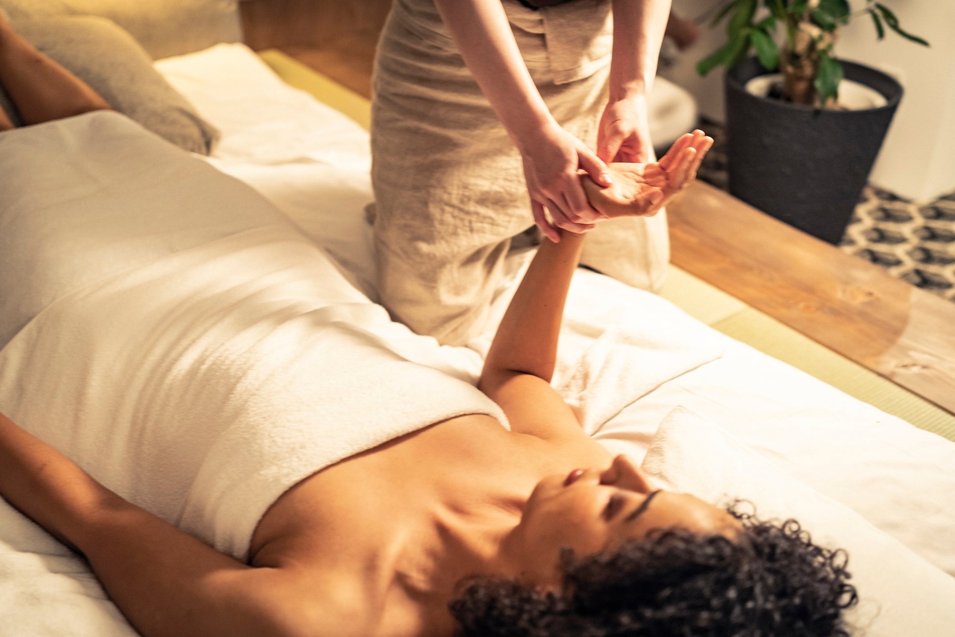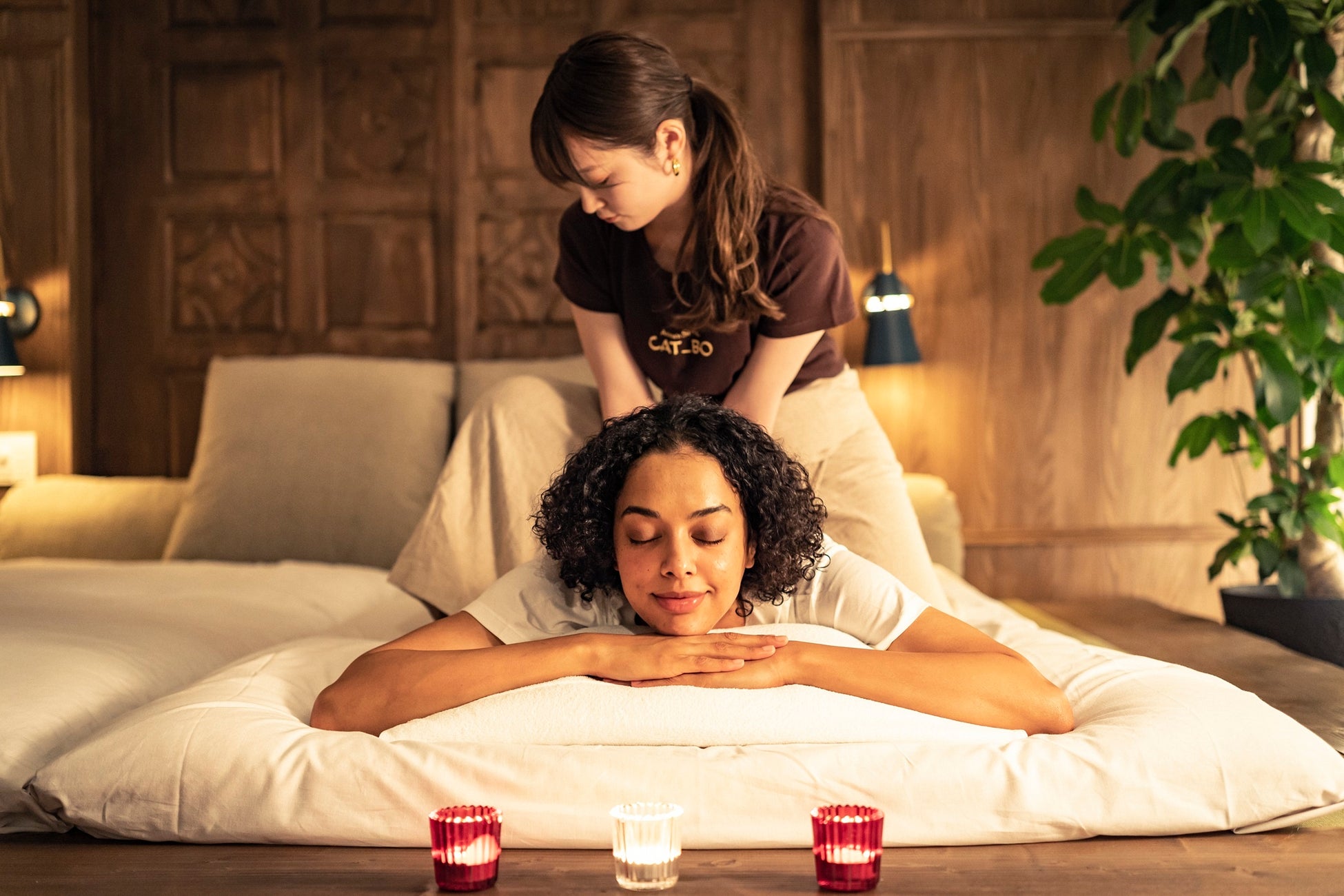 手で肌やカラダに触れると痛みが和らぎ、心が穏やかになる。日本人の記憶の中に刻まれている癒しの力「手当て」。手を当てたときの温かさと心からゲストを癒して差し上げたいという想いを伝える手技、それがキャットボーオリジナルのナチュラルハンドマッサージです。
