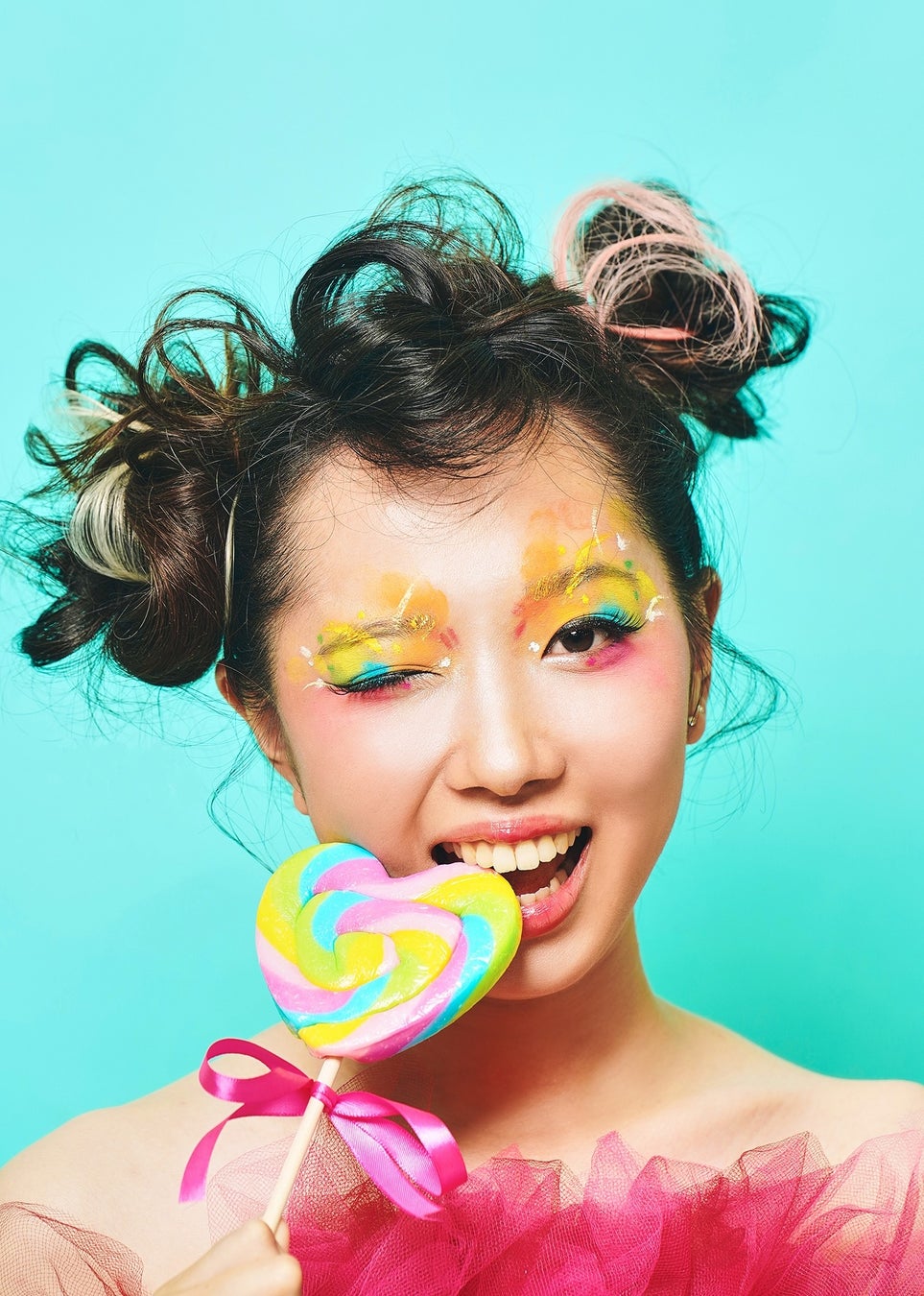 モデルの顔立ちはポップな感じが似合いそうだったので、様々な色のアイシャドウを散りばめて躍動感のある作品に仕上げました。制作に長い時間をかけたので、努力が評価されて嬉しかったです。将来は海外で活躍したいので、この受賞を糧に、世界で通用するメイクアップアーティストになりたいです。