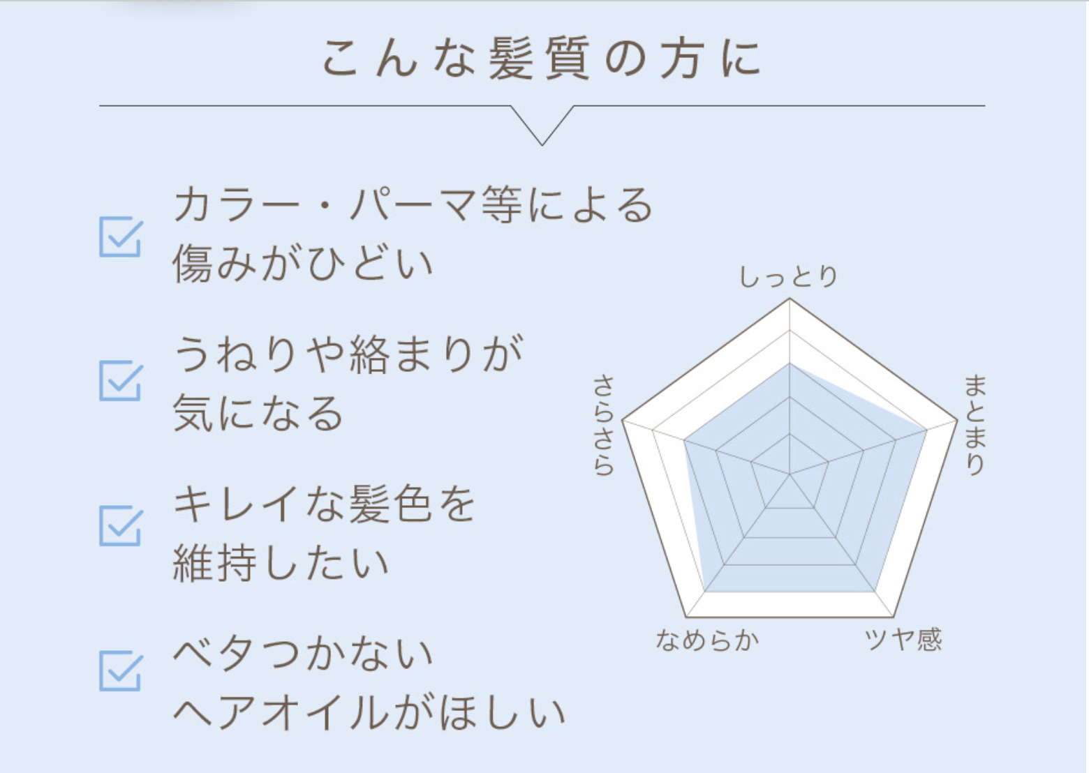 ホホバオイル、ローズヒップオイル、アルガンオイル、ひまわりオイル、グレープシードオイル、マカダミアナッツオイル、ツバキ種子油、アンズ核油またはパーシック油、ゆず果皮油のモイスチャー成分を9種類配合しております。しっかりと髪を保湿します。
