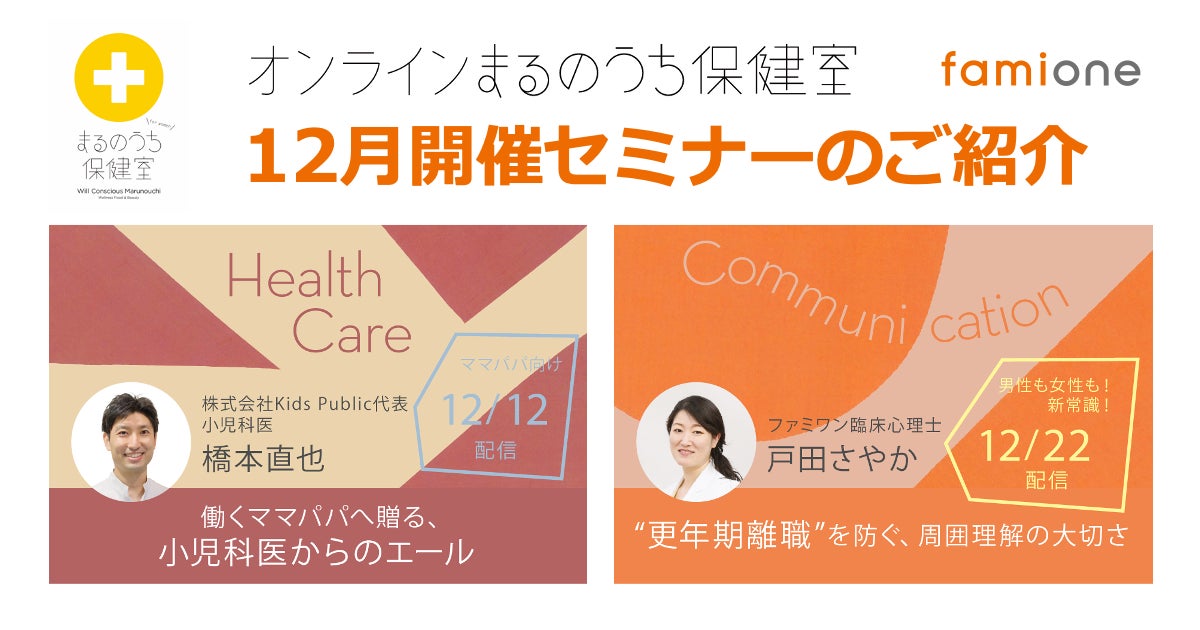 12月のオンラインセミナーには、株式会社Kids Public代表 小児科医 橋本 直也氏、株式会社ファミワン 臨床心理士 戸田さやかが登壇します。橋本氏のセミナーは、「働くママパパへ贈る、小児科医からのエール」と題し、仕事と育児に奮闘するママパパへ、小児科医より少しだけ気持ちが軽くなるメッセージをお届けします。戸田のセミナーでは、男女ともに誰もが迎える更年期の心の体の変化について、正しい知識と理解を得るための最新情報をお伝えいたします。どなたでも参加可能ですので、ぜひ申込ページよりご登録ください。