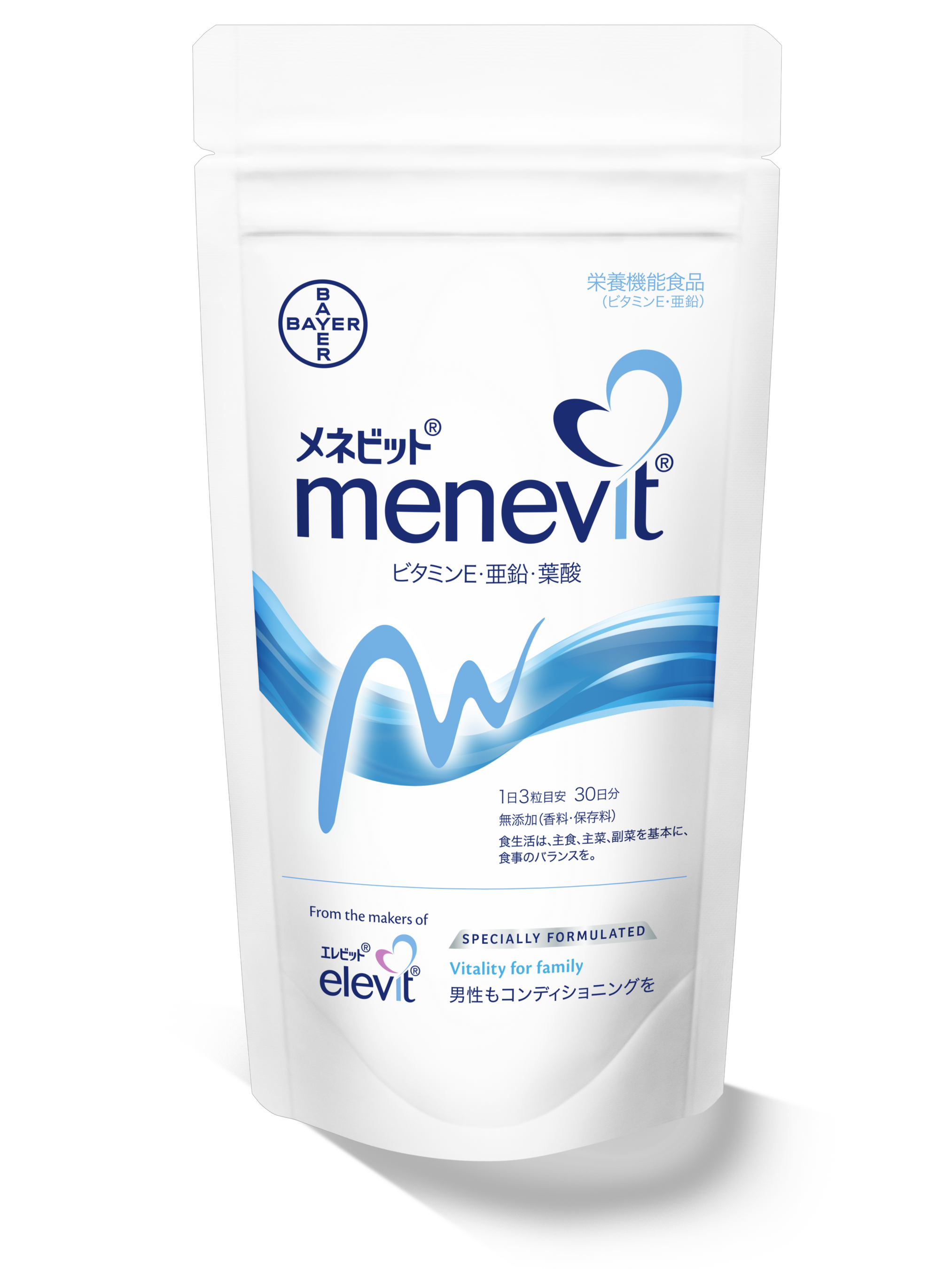 「メネビット®」は、プレナタル**サプリメント「エレビット®」シリーズから生まれた男性用サプリメントです。抗酸化作用を持つ栄養素として代表的なビタミンEや、コンディショニングに大切な細胞の代謝をサポートするミネラルの亜鉛など、男性の妊活を支える9つの栄養素をバランスよく配合したマルチビタミンサプリメントとなっています。