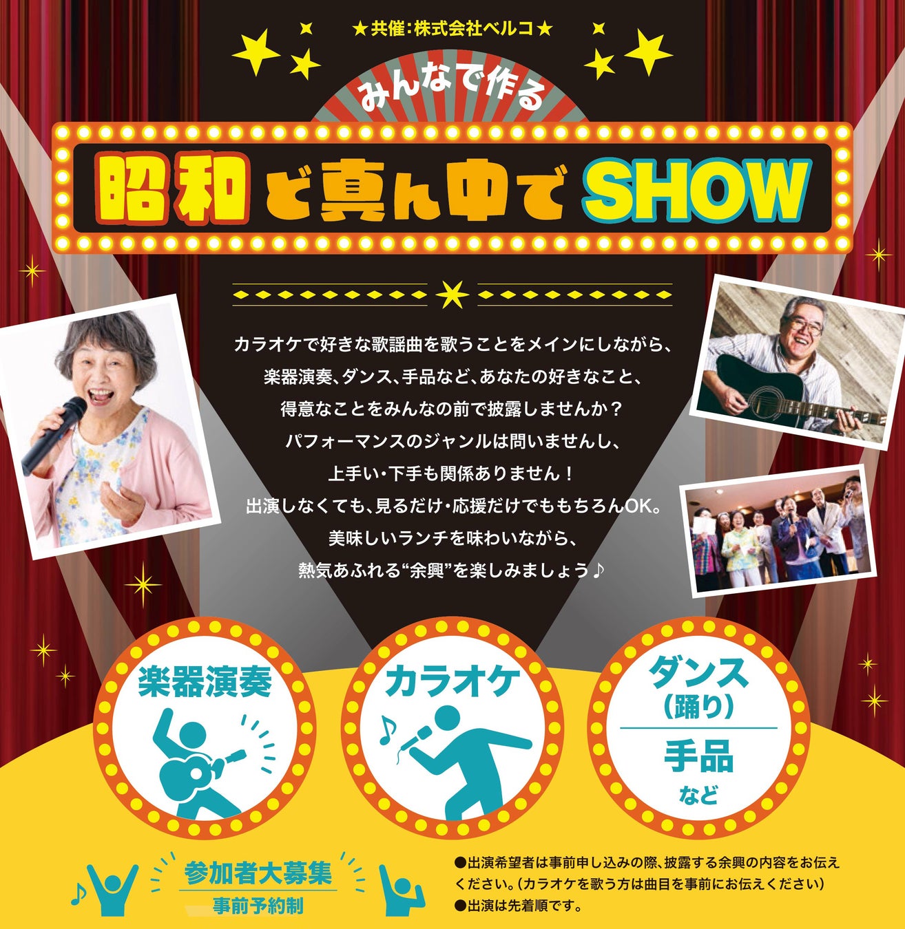 この度、株式会社ベルコでは西日本エリアで情報誌さくらと共催で「みんなで作る昭和ど真ん中でSHOW」を2月日(木)創案物語Shion(しおん)にて開催いたします。