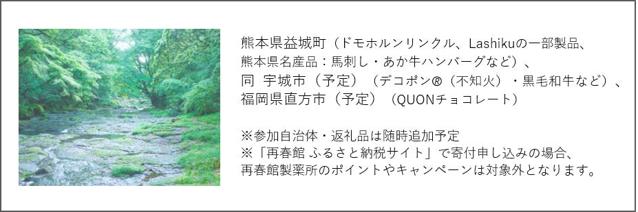 現在は製品中心に掲載されている、再春館製薬所提供の返礼品についても随時領域を拡大予定。「人間も自然の一部」という漢方の考え方にもとづき、自然からの恵みを人の力に活かす製品づくりを行えることへの”恩返し”につながる取り組み(熊本が世界に誇る「地下水」を守る公益財団法人との協業をはじめとする、自然との共生・サステナビリティ活動)なども積極的に拡充してまいります。