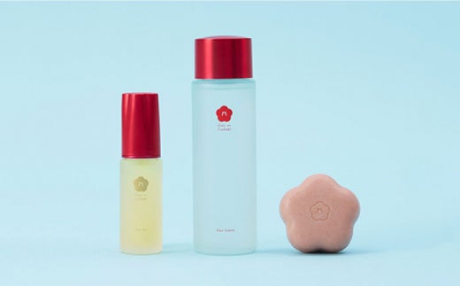 五島の椿のスキンケアは、「椿酵母せっけん」、「椿の葉 保湿水」、「椿酵母オイル」。