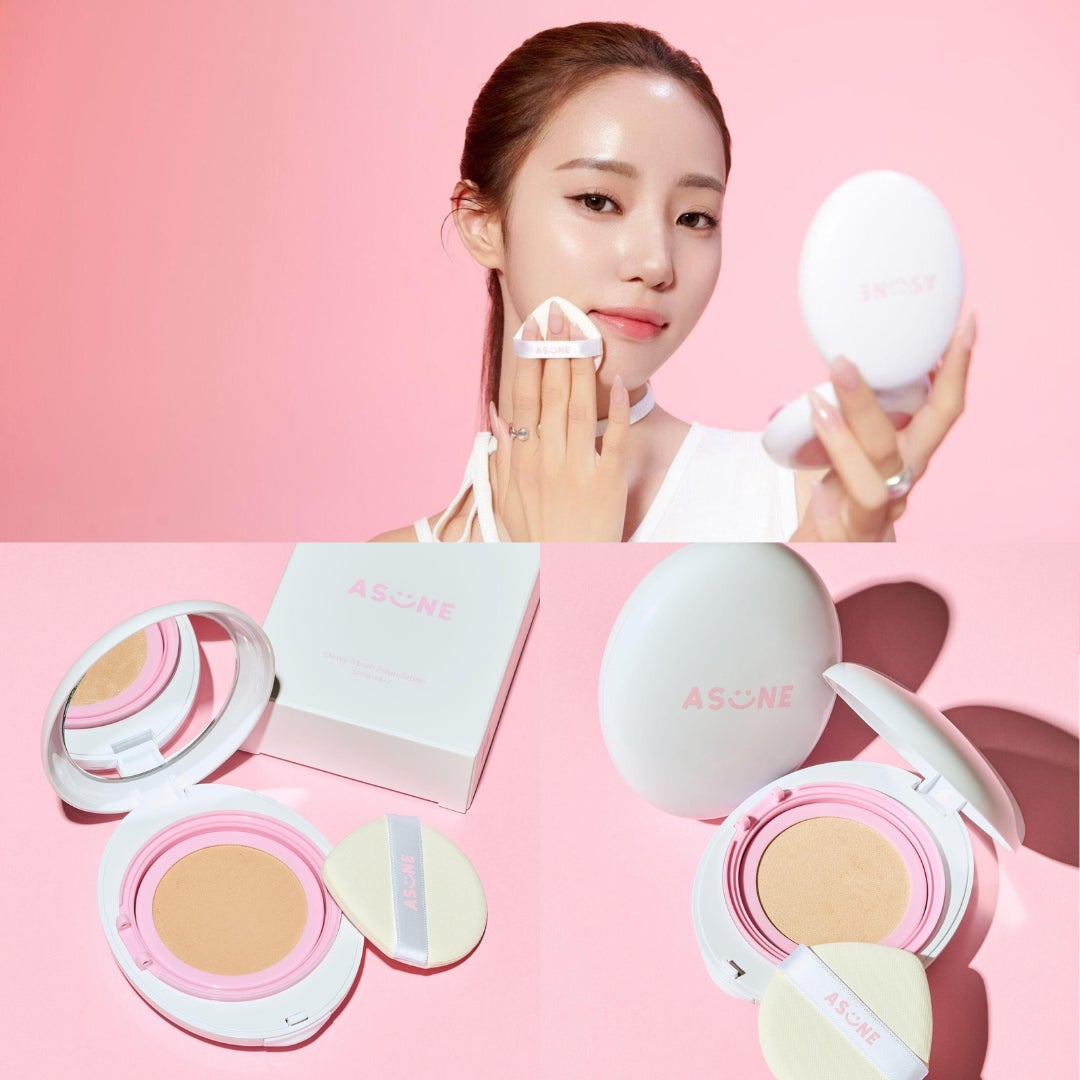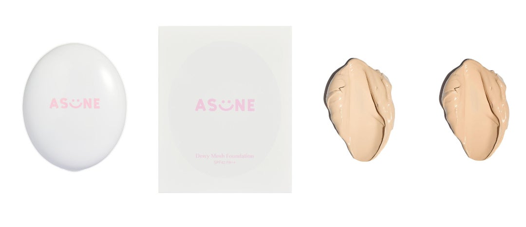 ASUNEの新商品「デューイーメッシュファンデーション」は軽い付け心地で肌に密着し、ひと塗りで簡単にツヤめく肌を演出。