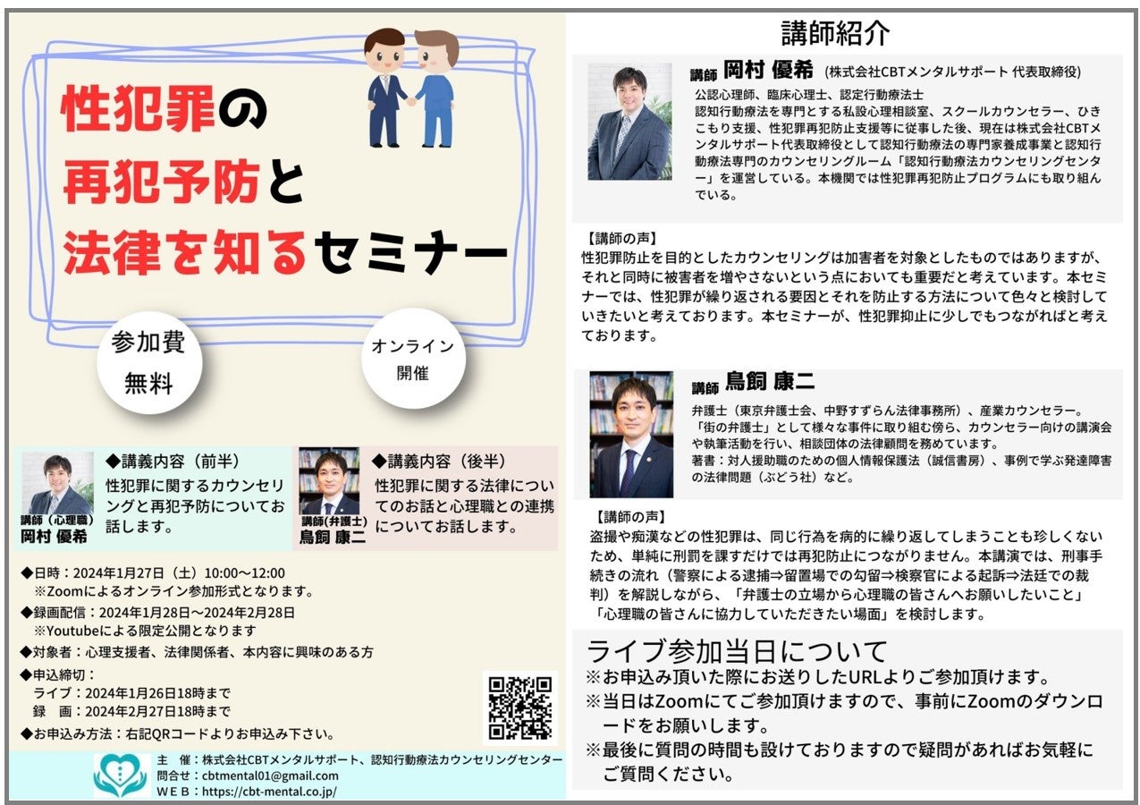 この度、認知行動療法カウンセリングセンター広島店では性犯罪再犯予防のためのカウンセリングと法律についての無料オンライン公開講座を開催致します。当日は弁護士と公認心理師がそれぞれの観点からお伝えします。