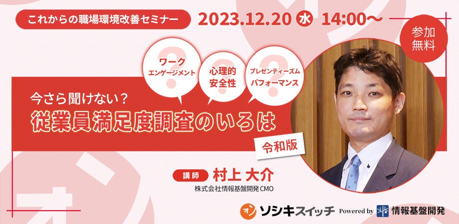株式会社情報基盤開発(本社:東京都文京区、代表取締役:鎌田長明、以下情報基盤開発)は2023年12月20日、“これからの職場環境改善”セミナーの一環として「今さら聞けない?従業員満足度調査のいろは〔令和版〕」をオンライン開催致します。
