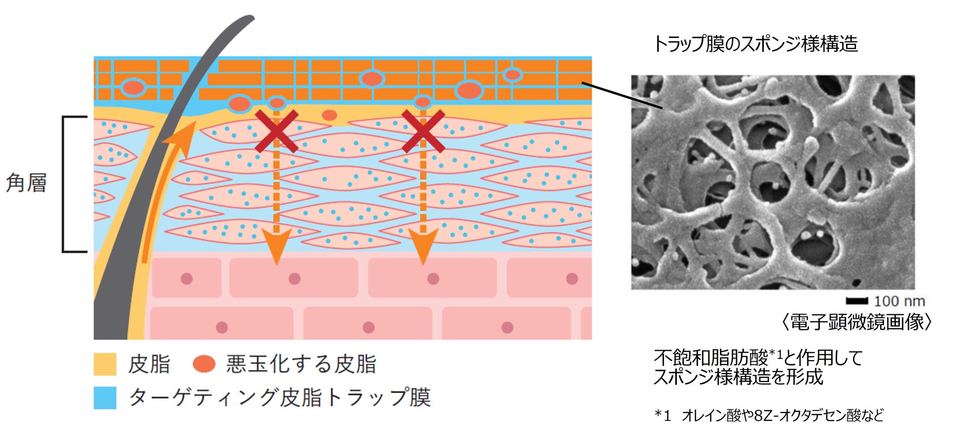 新技術「ターゲティング皮脂トラップ」:不飽和脂肪酸を速く、持続的にトラップ。悪玉化する皮脂の運動性を抑え、肌への浸透を防ぐ。