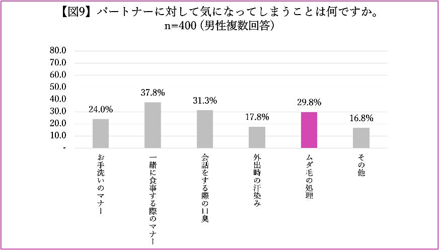 また、男女別に見た際に、女性がパートナーの印象を崩さないように意識しているポイントで多かったのが「ムダ毛の処理(65.0%)」だった(図8)のに対して、女性のムダ毛を気にする男性は29.8%に留まり、女性は「ムダ毛」に過剰に意識しすぎてしまっていることもわかった。(図9)