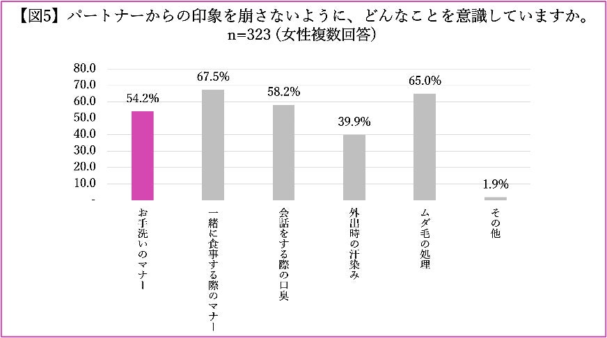 次にパートナーからの印象を崩さないように、どんなことを意識しているか複数回答を見ると男女ともに、55.1%の方が「お手洗いのマナー」であった。最も意識しているポイントではないものの、お手洗い中の見られていない時にもパートナーの印象を崩さないように意識していることがわかった。(図3)