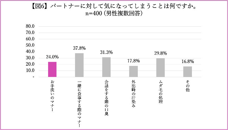 パートナーからの印象を崩さないように意識していること(図2)および、パートナーに対して最も気になってしまうこと(図7)で男女ともに多かったのは、「一緒に食事する際のマナー」についてであり、それぞれ32.6%と41.5%という結果に。自身が印象を崩さないように意識するポイントは、相手に対しても気にしてしまうことがわかった。