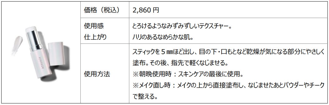 うるおいを引き込み・抱え、そしてうるおいでハリのあるなめらかな肌印象になるスティック状美容液。2色をレイヤードするだけで大人の抜け感メイクがつくれるアイカラー。一日中美しい仕上がりをキープするジェルアイライナー。そして、ポンポンと肌にオンするだけで簡単キレイ、肌に溶け込むスキンカラーが自然な血色とツヤをプラスするチーク、全4アイテムを用意。