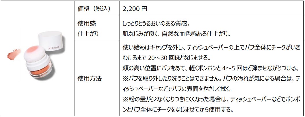 肌に溶け込むスキニーコーラルのカラーで、自然な血色とツヤをプラスするパフ一体型のチーク。ポンポンとオンするだけで、手早くキレイに、自然と上気したような血色感を生みます。フィルム化コラーゲンやヒアルロン酸、しっとりとした質感になるオイルコーティングパウダー、上品なツヤを与える極微細パール配合。